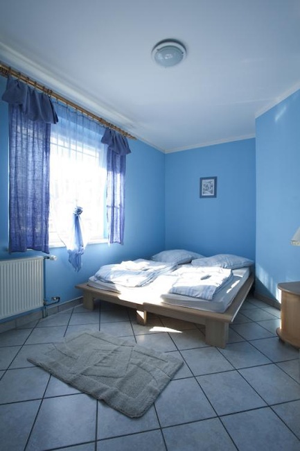 Apartament Niebieski został urządzony w delikatnych odcieniach błękitu i żółci, co tworzy w jego wnętrzu miłą dla oka i uspokajającą harmonię barw. Jest to luksusowy apartament dwupokojowy. Z przestronnego przedpokoju można przejść do przytulnej sypialni z łożem małżeńskim, dużą szafą z lustrami, stolikiem z lampką nocną, a także do wygodnego pokoju gościnnego.
